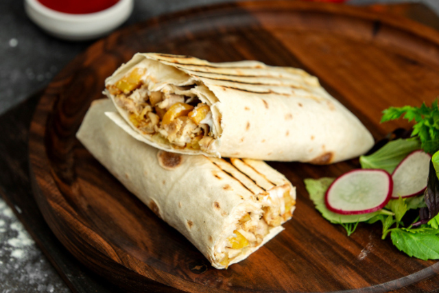 Our Crispy Chicken Shawarma features perfectly seasoned, crispy chicken wrapped in a soft pita with fresh veggies and creamy sauces. A delicious, satisfying bite every time!